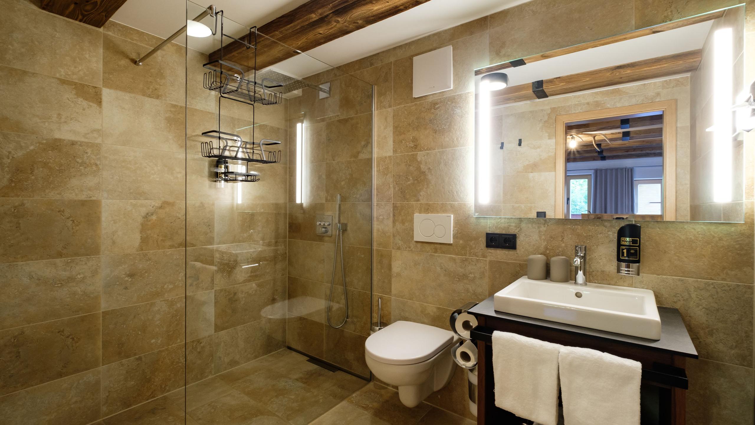 Luxury double room with balcony. Features box-spring bed, sofa bed or sofa, desk, oak parquet with underfloor heating, experience shower, toilet, towel heater, cosmetic mirror, Babyliss hairdryer, flat-screen TV, coffee and tea corner, fridge, digital guest folder, safe, and orientation light.