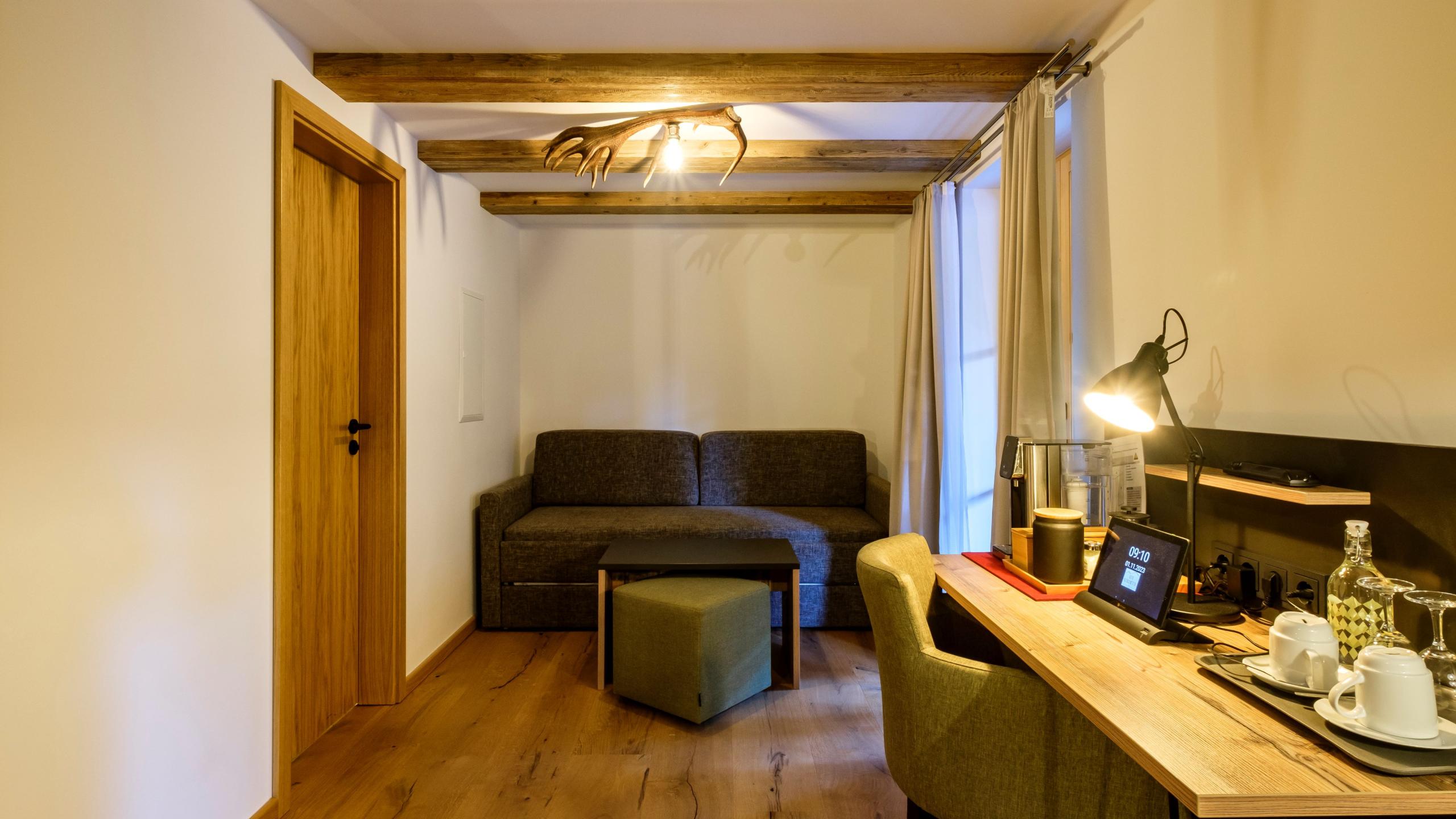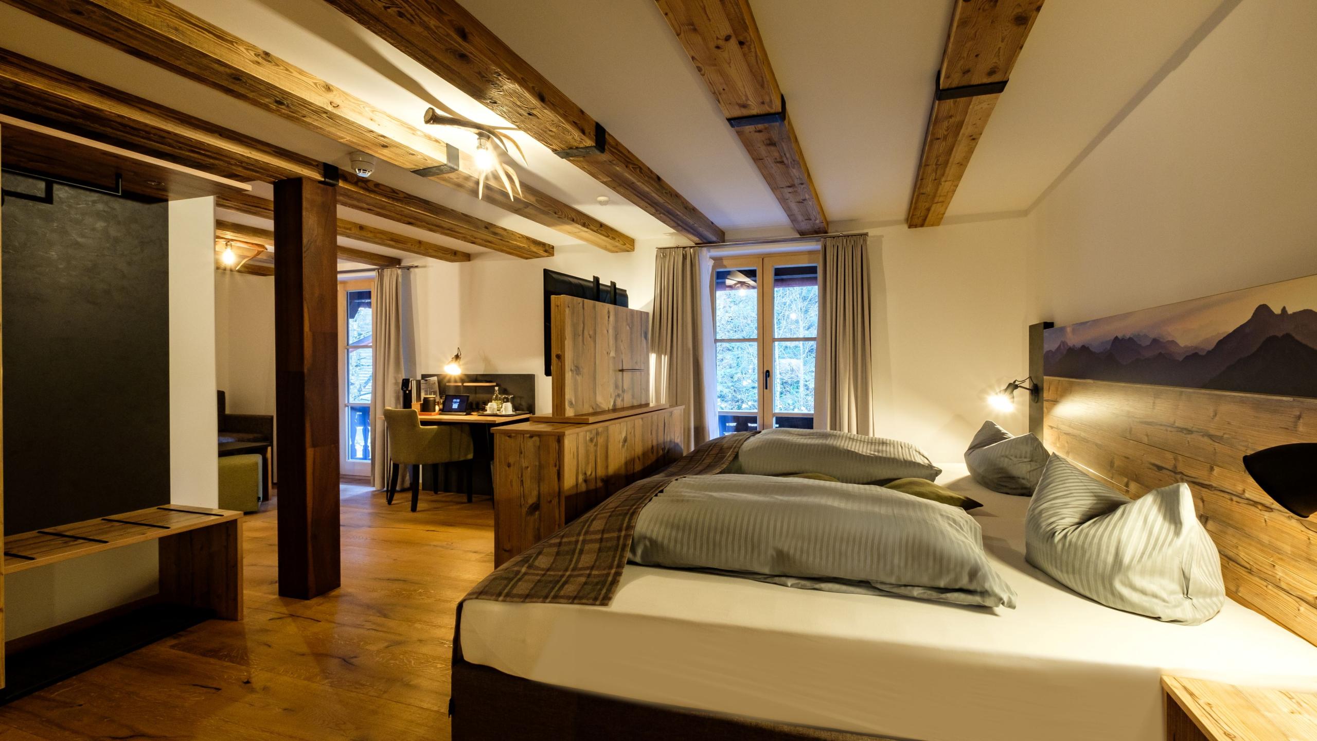 Doppelzimmer Superior mit Balkon Bachseite incl.Frühstück in unserem Lissy's-Restaurant mit Panoramablick Ausstattung: Boxspringbett, Schreibtisch, Fußbodenheizung, Eichenholzboden, Erlebnisdusche/WC, Flachbildschirm, Digitale Gästemappe, Zimmersafe Freie Nutzung des Skiraums bzw. Fahradraums und unserer hauseigenen Sauna.